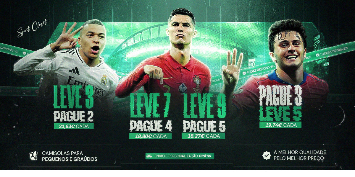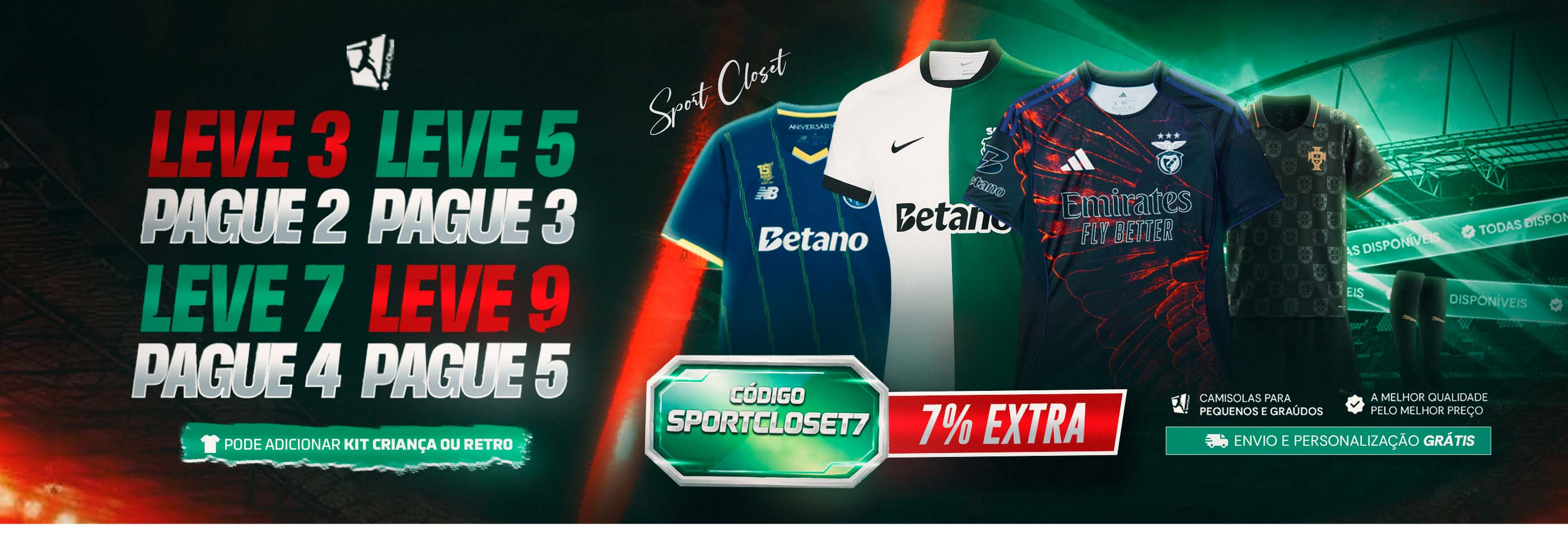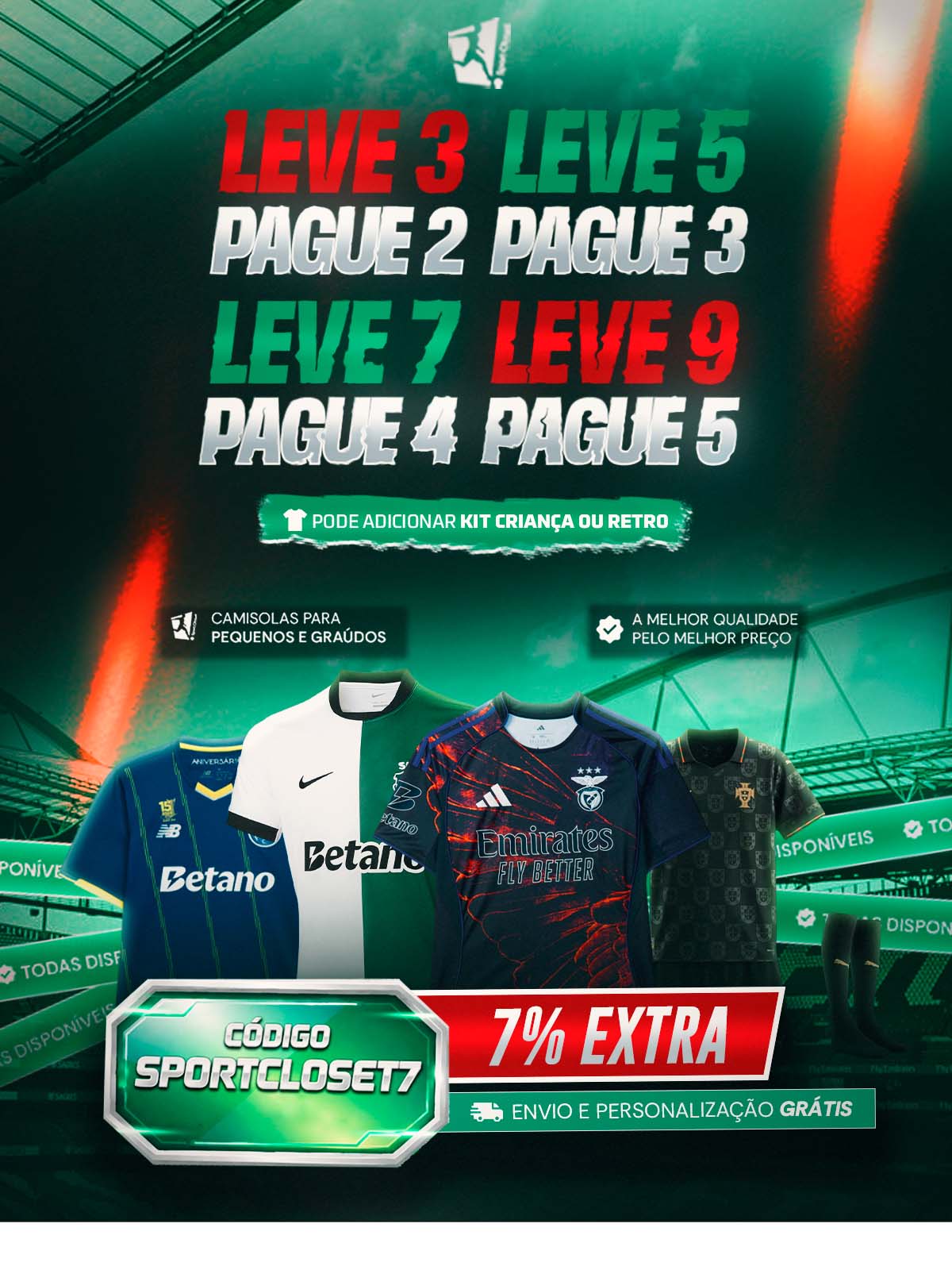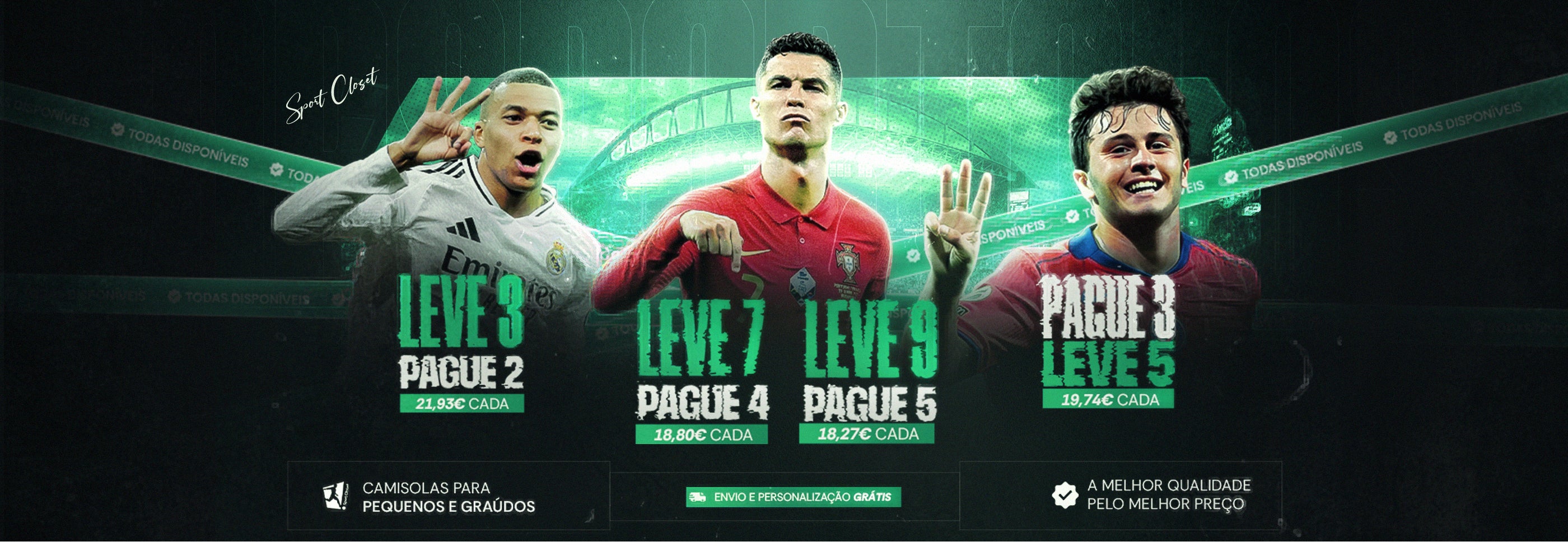 Com esta promoção, ao adicionar 3 camisolas ao seu carrinho, apenas pagará o valor de 2 delas. O desconto é aplicado automaticamente no checkout, não sendo necessário nenhum código adicional.